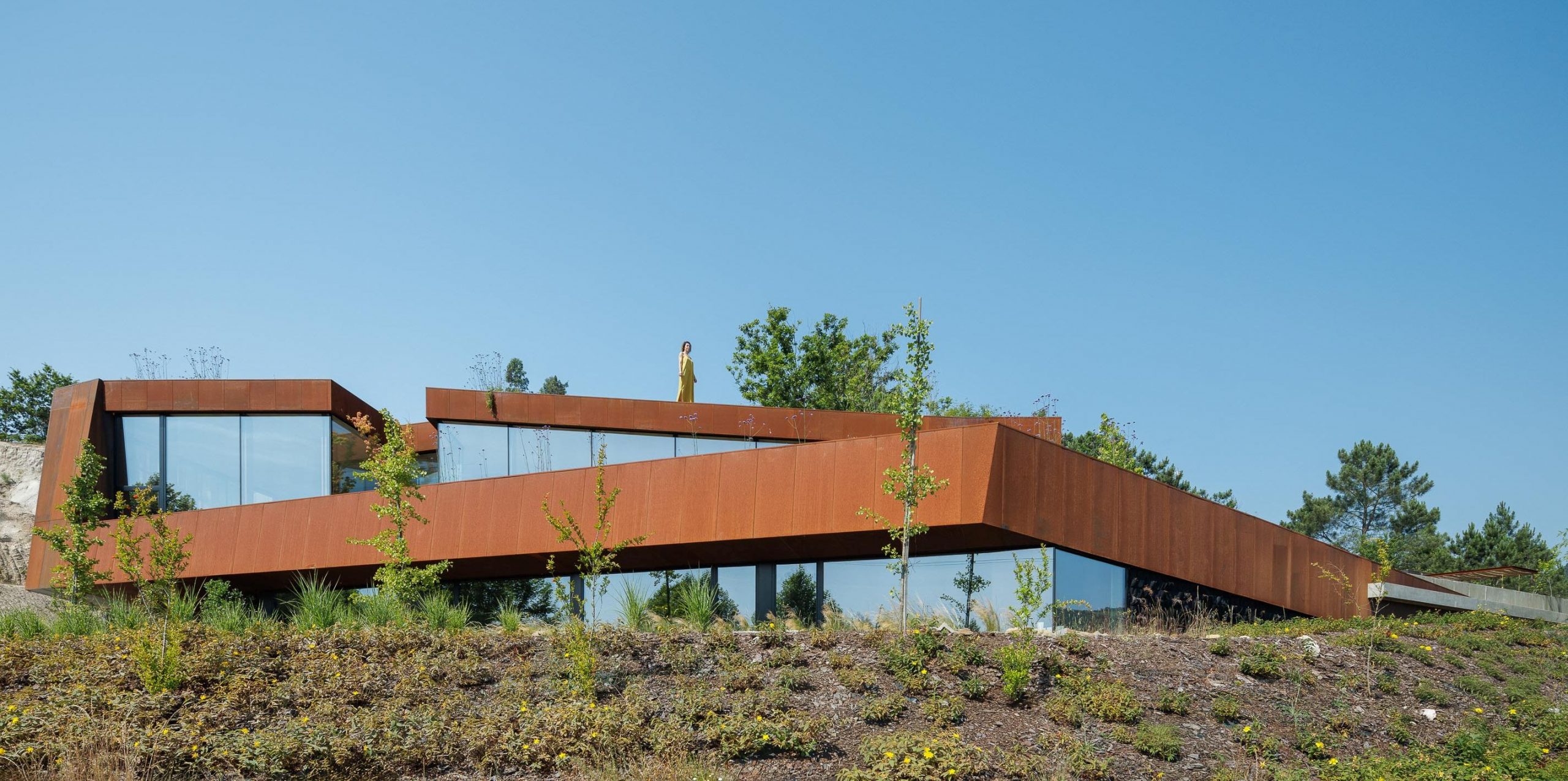 Built on the ruins of an old sawmill in Celorico de Basto, Casa Corten emerges from the land in harmony with the slope, preserving native vegetation. Green roofs extend the terrain, while glazed façades capture the western light and create a fluid connection between interior and exterior.