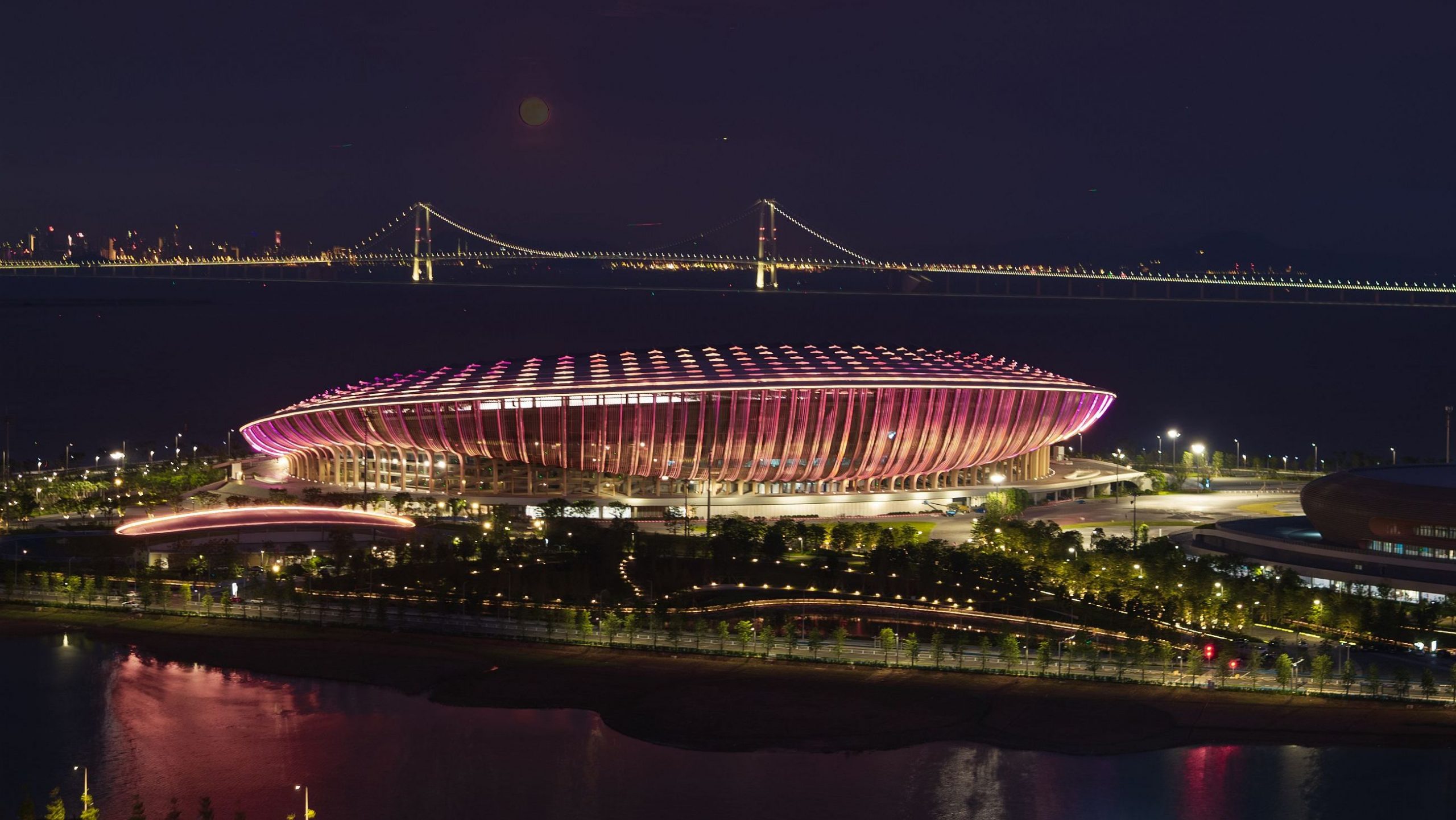 The sports center serves as a focal point for the new civic, commercial, and residential district at the heart of the Greater Bay Area. Photo by Seilaojiong.