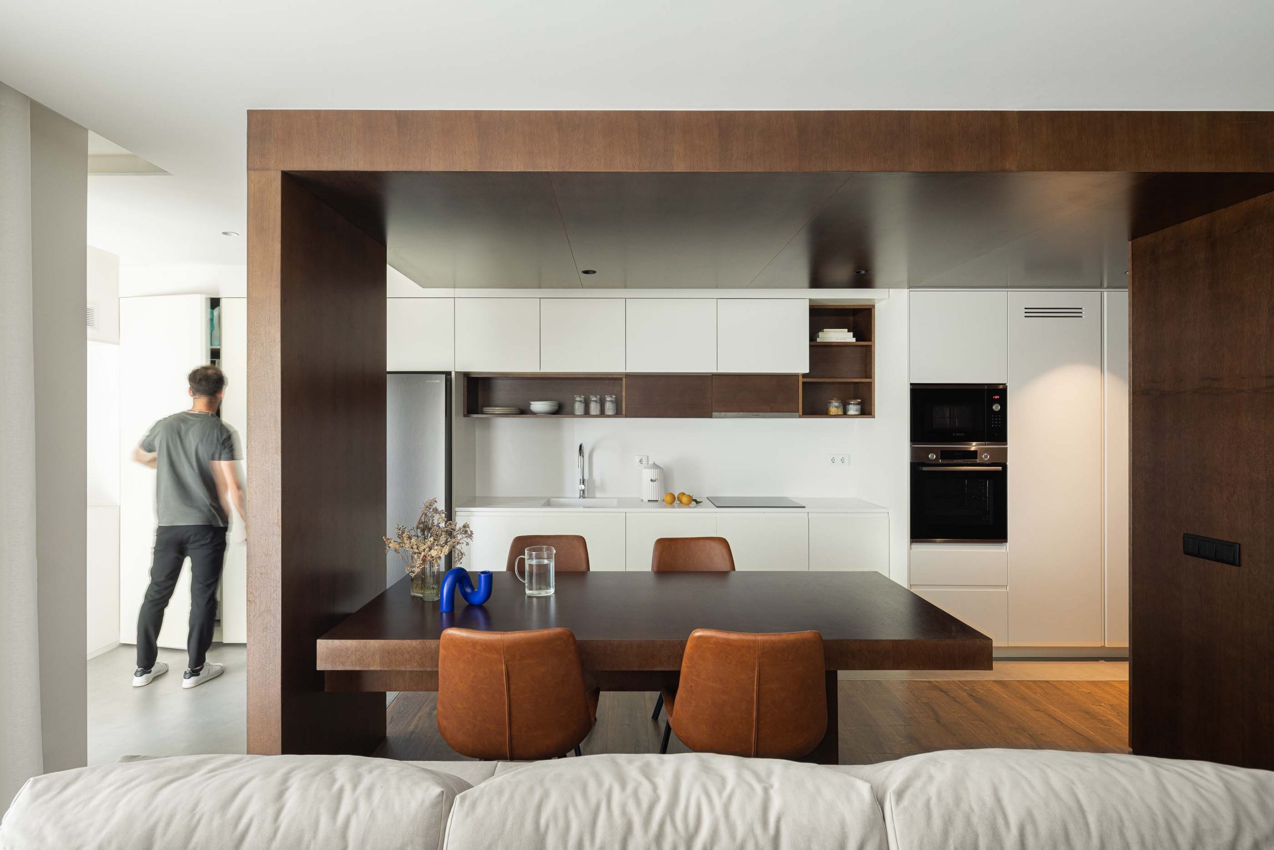 Inti dari proyek ini terletak pada serangkaian elemen yang dirancang khusus untuk menata sekaligus meningkatkan kualitas ruang. Meja makan, yang dirancang khusus untuk apartemen ini, memiliki peran penting sebagai elemen transisi antara dapur dan ruang keluarga, mendefinisikan fungsi tanpa perlu sekat fisik. Meja kerja juga dirancang khusus dan terintegrasi secara halus dalam keseluruhan tata ruang. Perapian dua sisi memperkuat kesinambungan visual antar area hunian, sementara area pintu masuk dilengkapi dengan lemari kustom yang mengorganisasi ruang sekaligus memperkenalkan bahasa arsitektur proyek sejak awal.