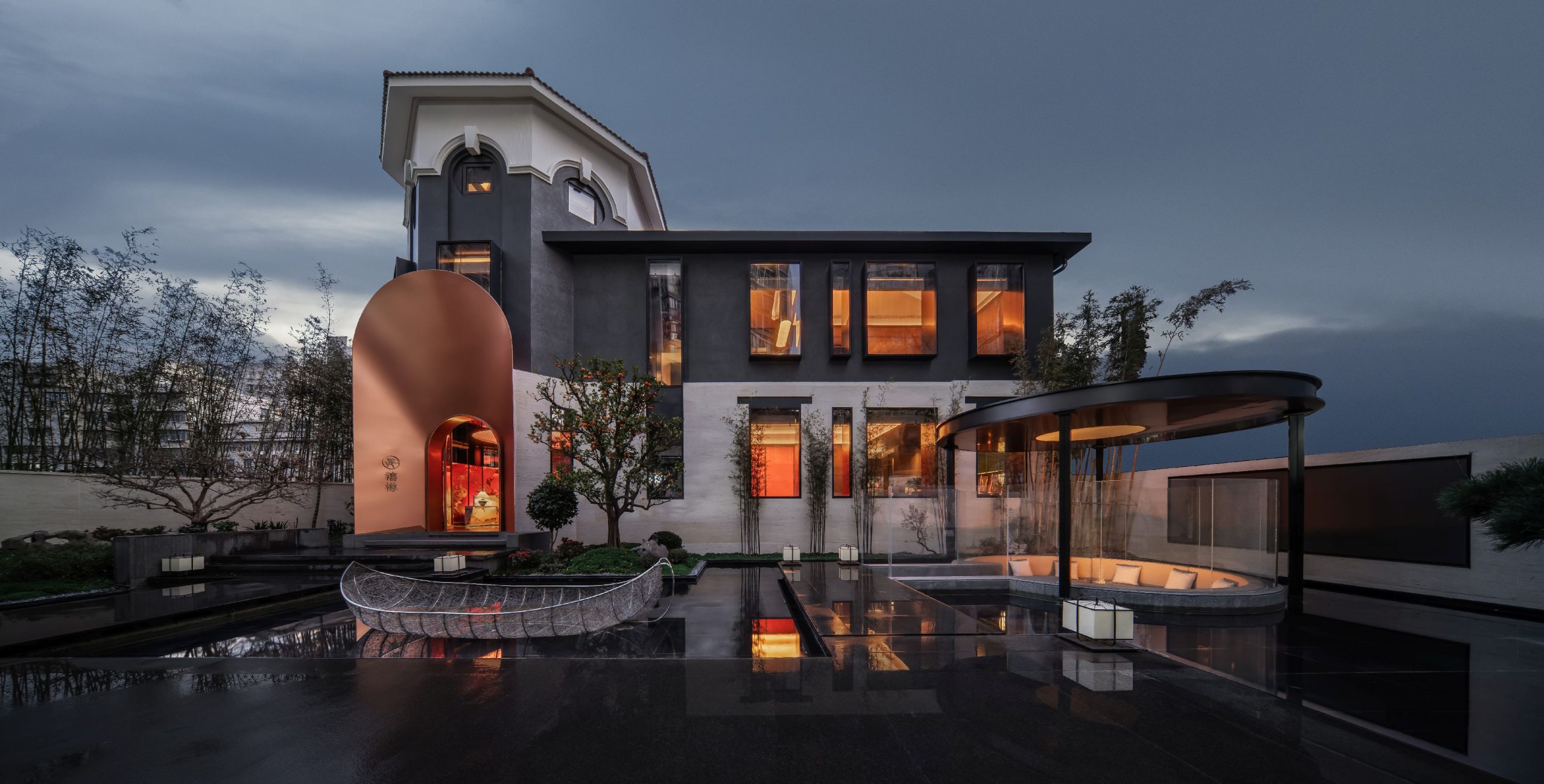 Saat malam tiba, pencahayaan menjadi medium utama dalam membangun emosi. Sistem pencahayaan berlapis—yang menggabungkan lampu gantung, lampu linear, sumber cahaya tersembunyi, serta permukaan reflektif—memungkinkan cahaya mengalir melintasi batu giok merah, kayu eboni, dan bata biru, menciptakan pengalaman visual yang berkesinambungan sekaligus menenangkan.