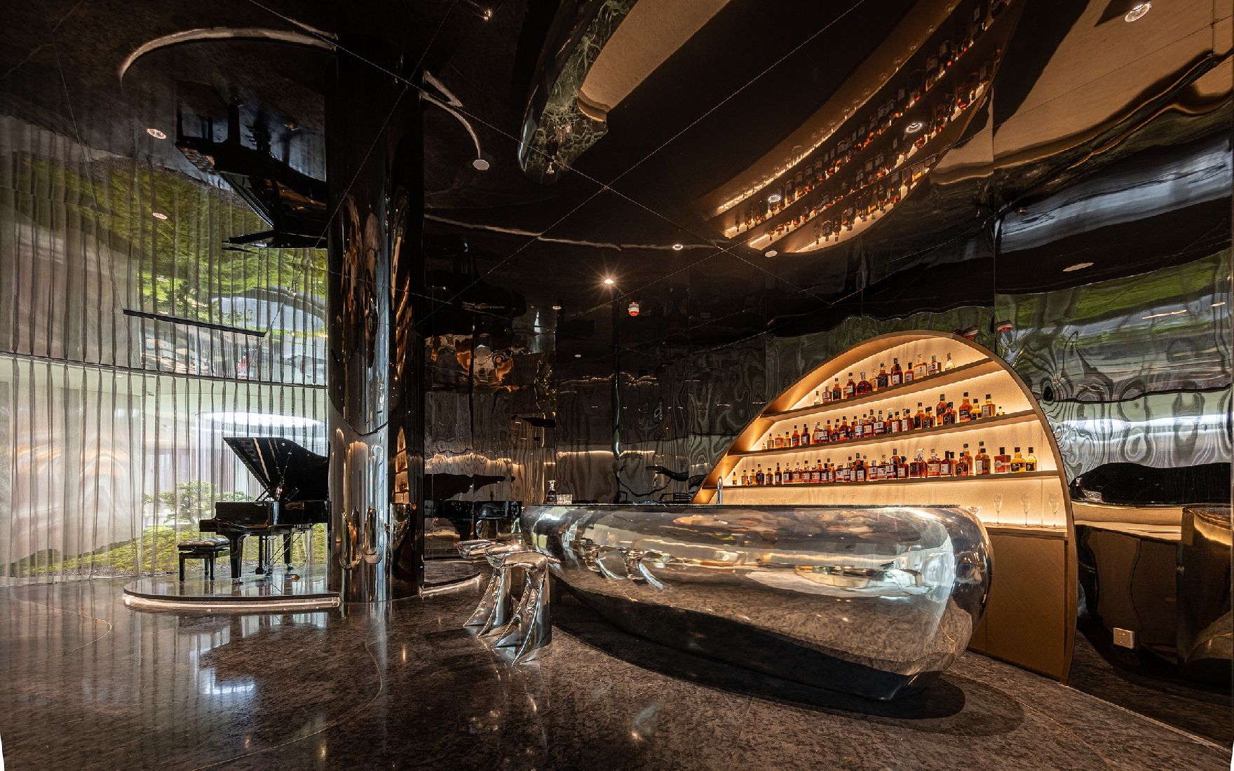 Bar anggur merah dan cerutu menampilkan keanggunan melalui keteraturan ekstrem, sementara jade hijau lembut melanjutkan “nafas alam”. Cahaya setenang tenunan kain, sementara ruang menghembuskan keagungan dalam keheningan.