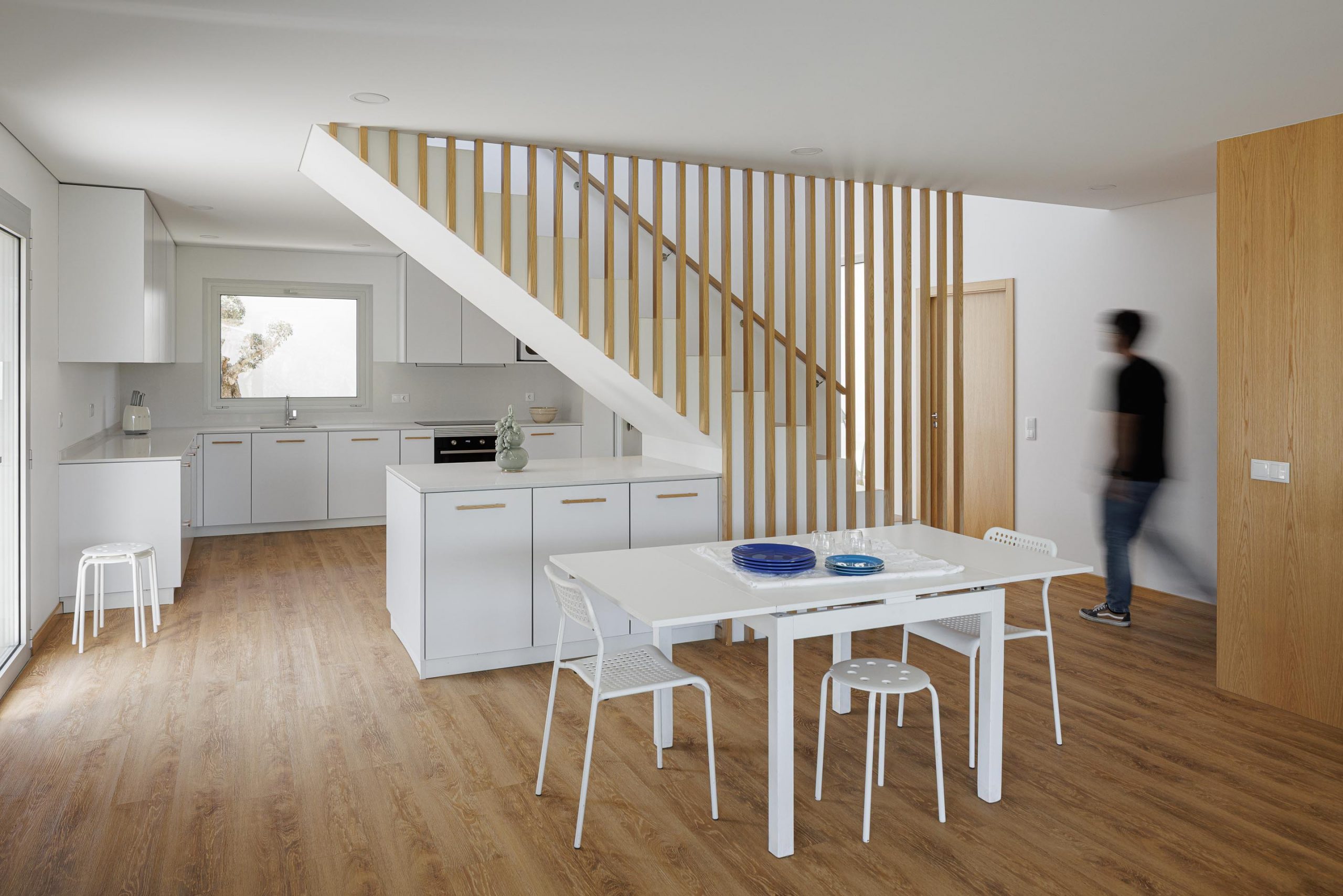 Di dalam sisa ruang reruntuhan, selain area masuk, terdapat dapur — area paling penting dalam rumah-rumah di wilayah Minho. Dapur ditempatkan pada posisi yang mirip dengan aslinya, sehingga mempertahankan logika penggunaan sebelumnya. Di atasnya, sebuah volume kecil menjadi studio/atelier, menjaga dua lantai yang sudah ada dengan atap genteng tradisional. Upaya ini mengintegrasikan bangunan dengan lembut ke lingkungan sekitarnya dalam dialog dengan rumah-rumah tetangga.